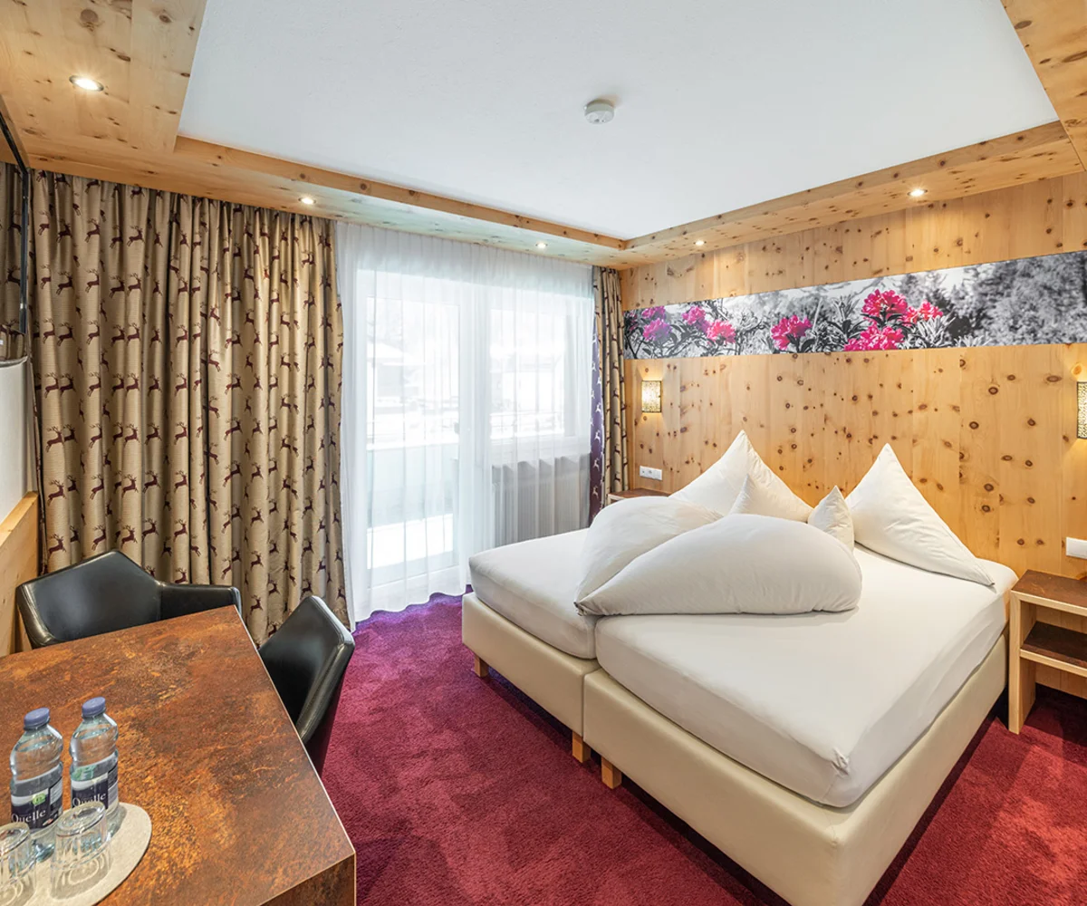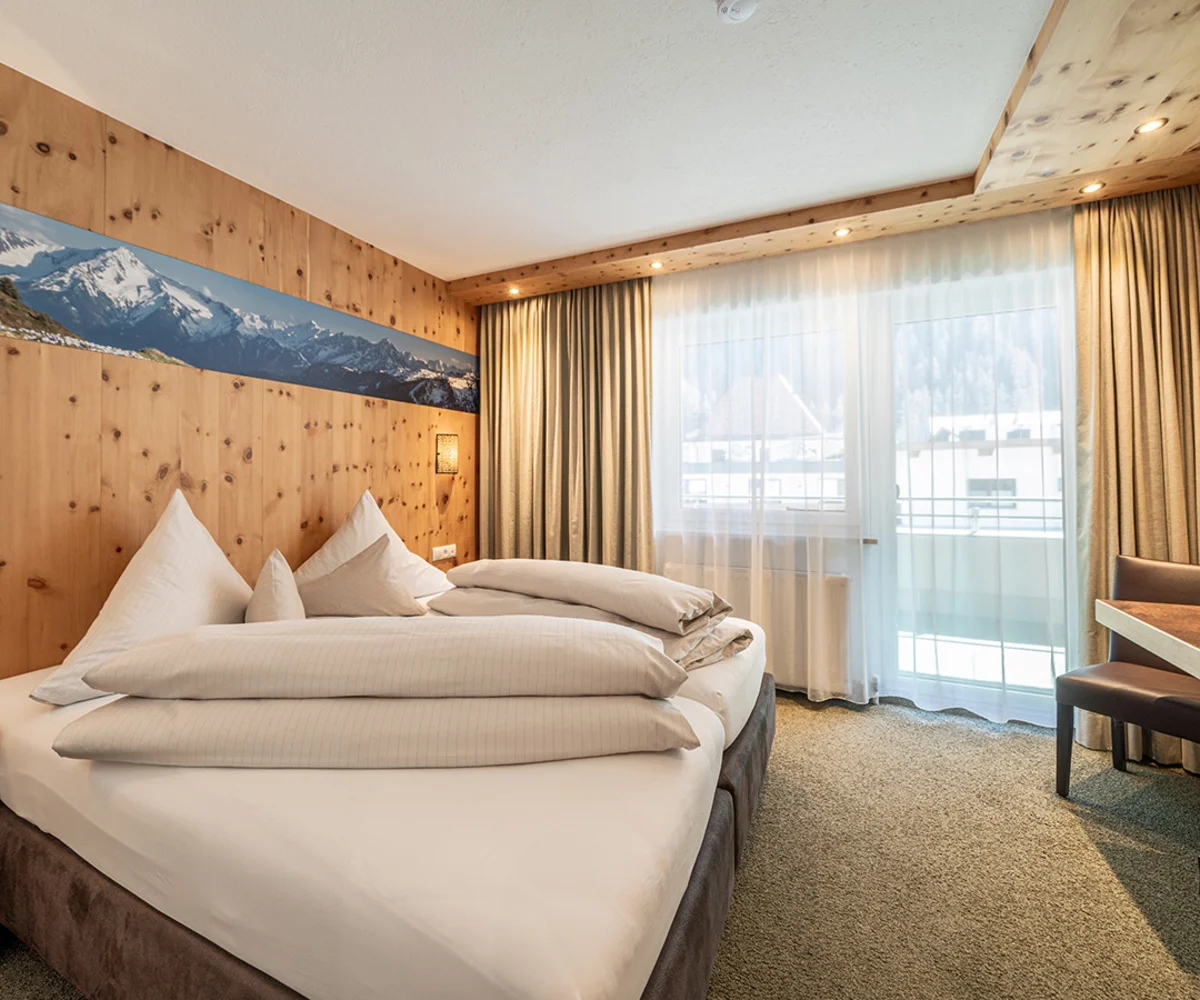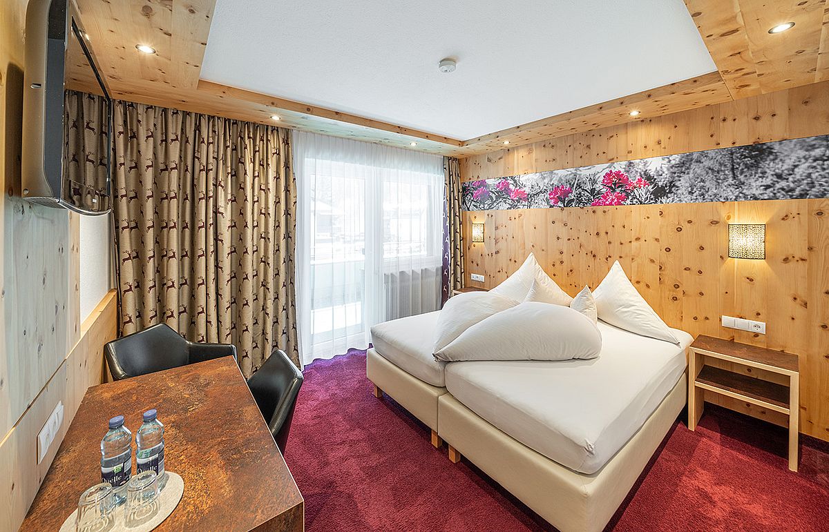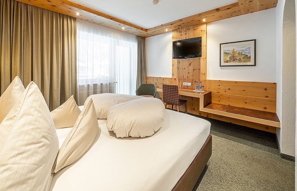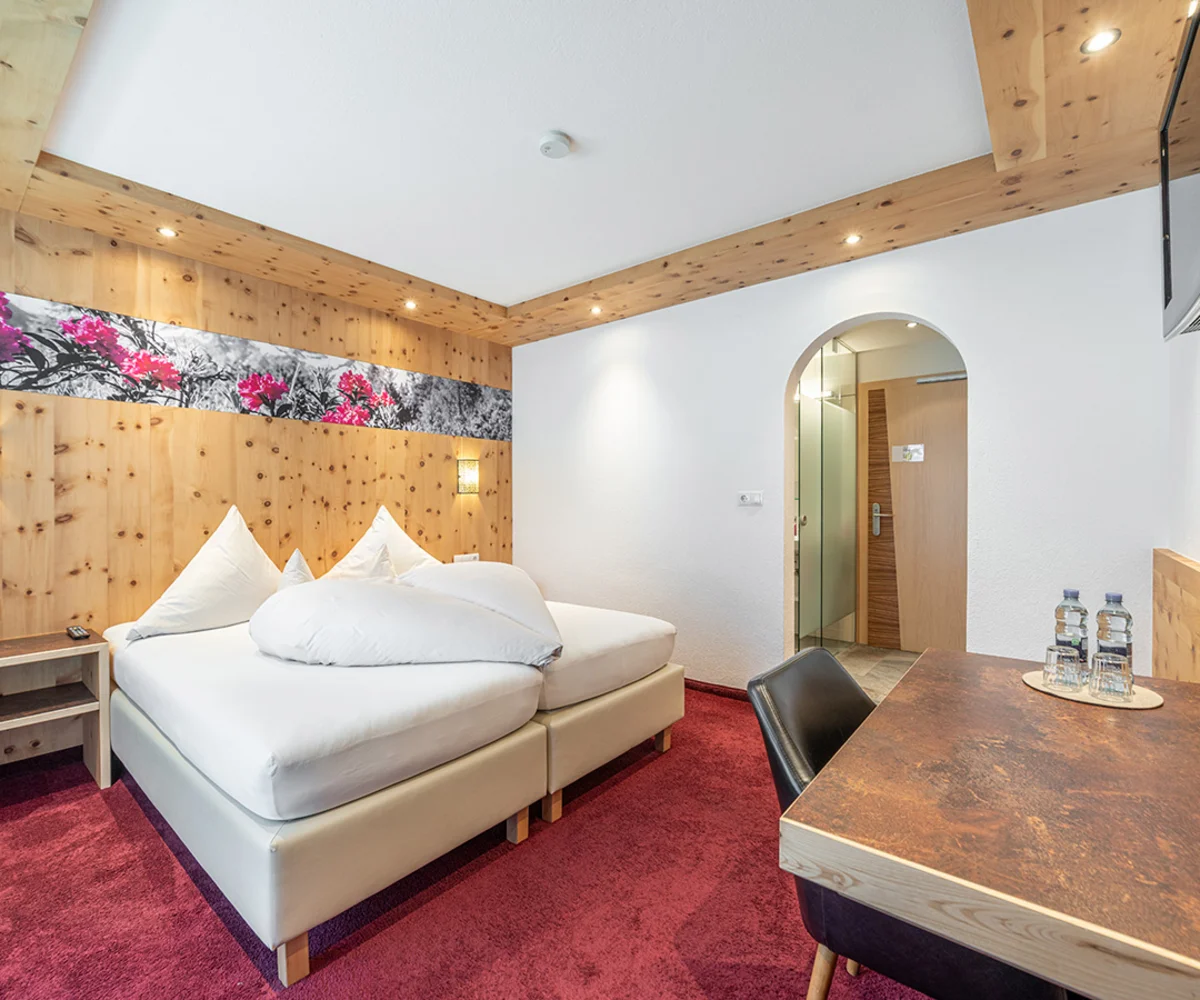 Ankommen, abschalten und sich sofort heimisch fühlen – unsere liebevoll gestalteten Doppelzimmer mit Balkon sind der perfekte Rückzugsort für erholsame Urlaubstage im Herzen der Ötztaler Alpen. Natürliche Töne, gemütliche Stoffe und – in einigen Zimmern – duftendes Zirbenholz schaffen eine behagliche Atmosphäre. Zur Ausstattung gehört ein TV, Radio, Safe, ein helles Badezimmer mit Badewanne und WC oder Dusche und WC sowie ein Haartrockner. Auf Wunsch können die Betten getrennt werden – für individuellen Komfort ganz nach Ihren Bedürfnissen. Auch eine Einzelbelegung ist möglich.