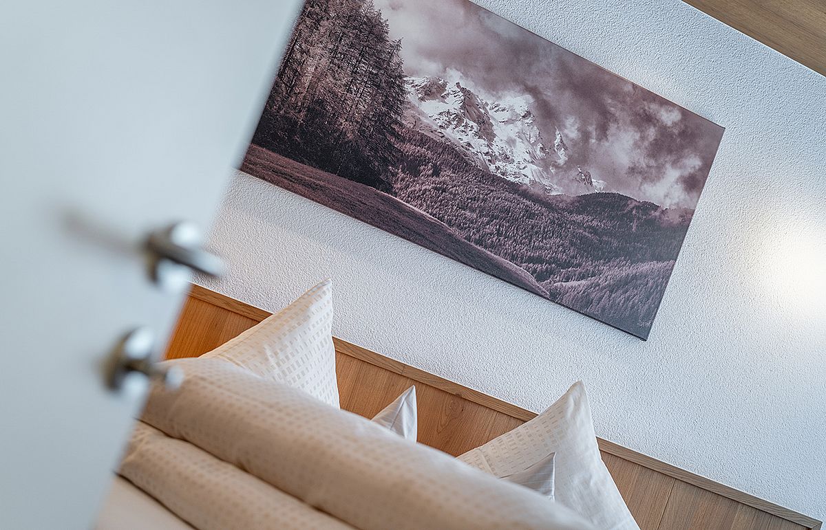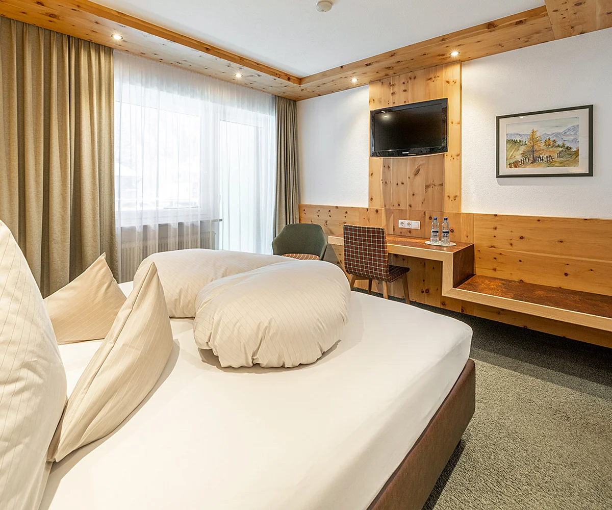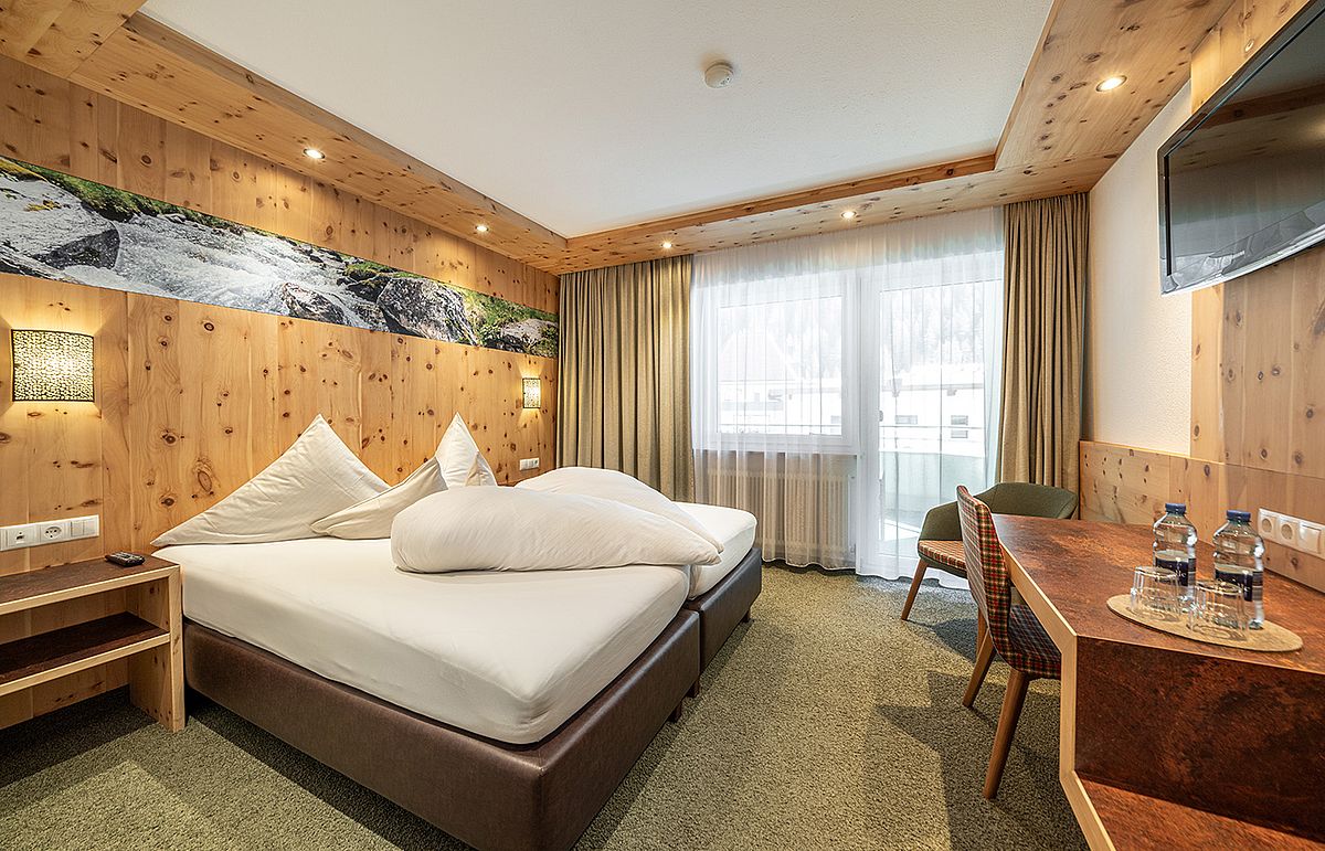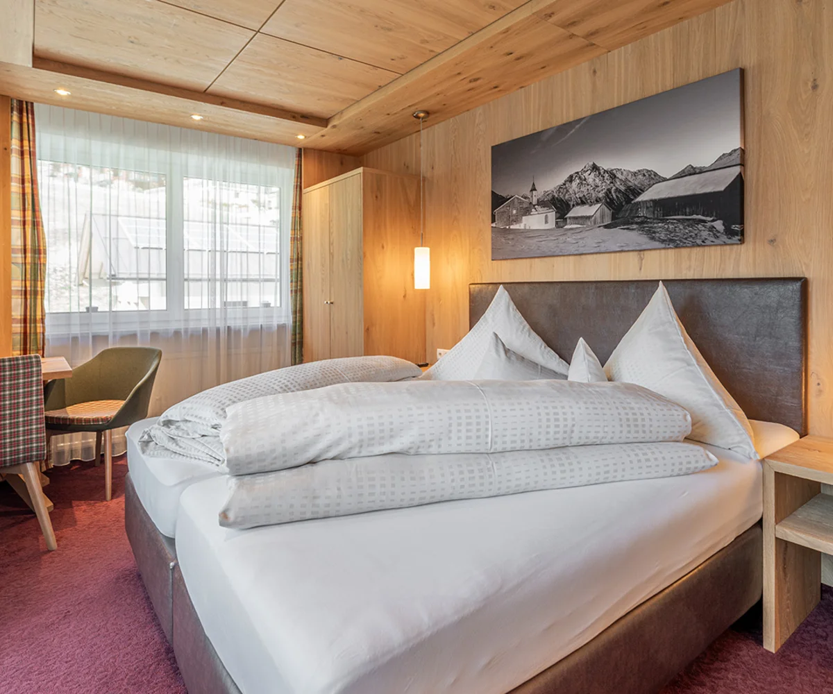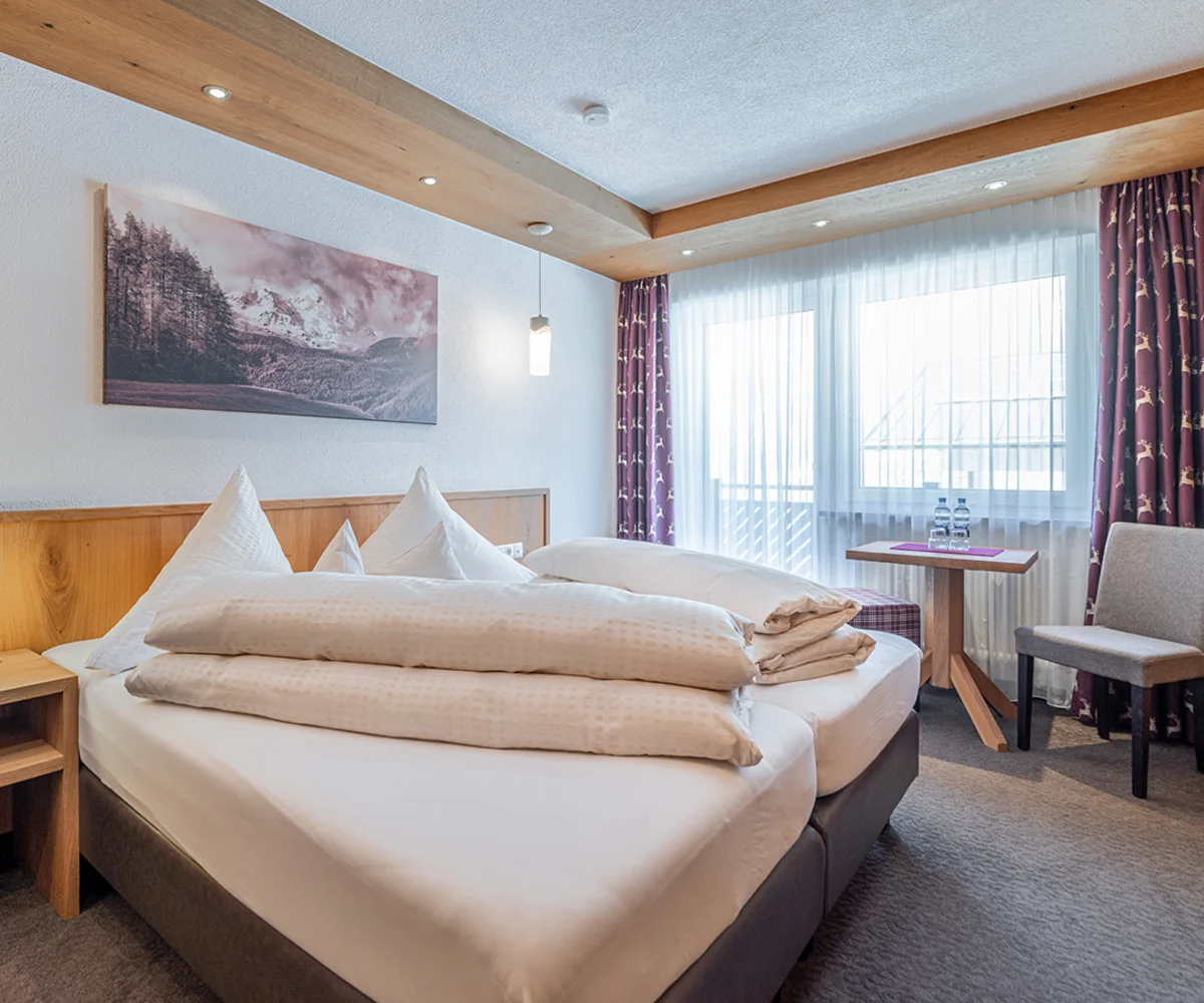 Ankommen, abschalten und sich sofort heimisch fühlen – unsere liebevoll gestalteten Doppelzimmer mit Balkon sind der perfekte Rückzugsort für erholsame Urlaubstage im Herzen der Ötztaler Alpen. Natürliche Töne, gemütliche Stoffe und – in einigen Zimmern – duftendes Zirbenholz schaffen eine behagliche Atmosphäre. Zur Ausstattung gehört ein TV, Radio, Safe, ein helles Badezimmer mit Badewanne und WC oder Dusche und WC sowie ein Haartrockner. Auf Wunsch können die Betten getrennt werden – für individuellen Komfort ganz nach Ihren Bedürfnissen. Auch eine Einzelbelegung ist möglich.